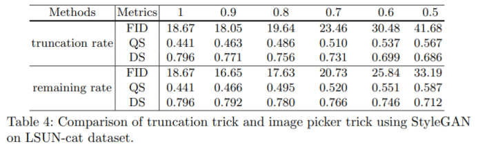 研究者用这些方法在 unconditional GAN 和 conditional GAN 上又验证了其有效性。第二个有趣的应用是通过后处理丢弃一部分图片,让剩余图片有更好的生成质量,他们验证了其比传统的 truncation trick 能更好地兼顾质量和多样性,如下表 4 所示: