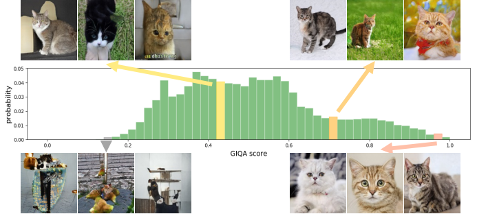 该方法还有很多衍生应用,其中一个是模型质量评估。对于生成模型,我们可以独立地衡量生成图片的质量和多样性。一批生成图片质量的平均值可以用来衡量模型的生成图片质量,研究者称之为 Quality Score(QS)。