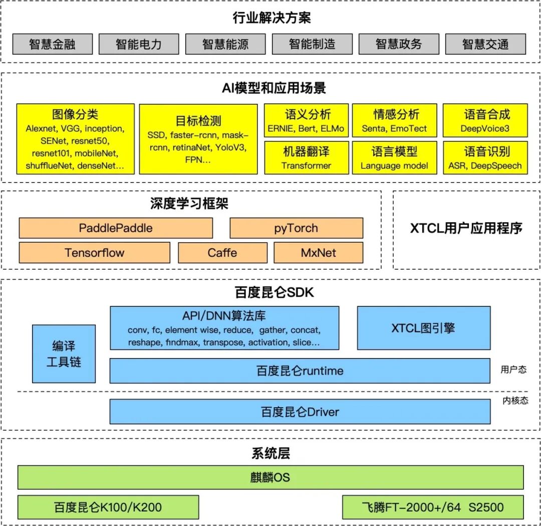 系统层:基于搭载飞腾 FT-2000+/64 芯片和百度昆仑 K100/K200 加速卡、安装麒麟操作系统的长城智擎 ZQ2200 自主 AI 服务器,前期已进行了深度的驱动适配工作。飞腾新一代多路服务器的适配也已在规划设计中。