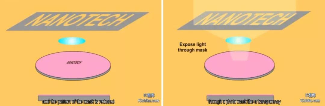 电子束光刻按照曝光方式划分可分为两种,投影式曝光与直写式曝光。投影式曝光通过控制电子束照射掩模图形,将掩模图形投影至光刻胶表面,把掩模板上的图案转移到光刻胶上,原理类似于照相机,拍摄对象好比掩模板,光刻胶就像是胶卷,通过光线的照射把拍摄对象投影到胶卷上,如图所示。