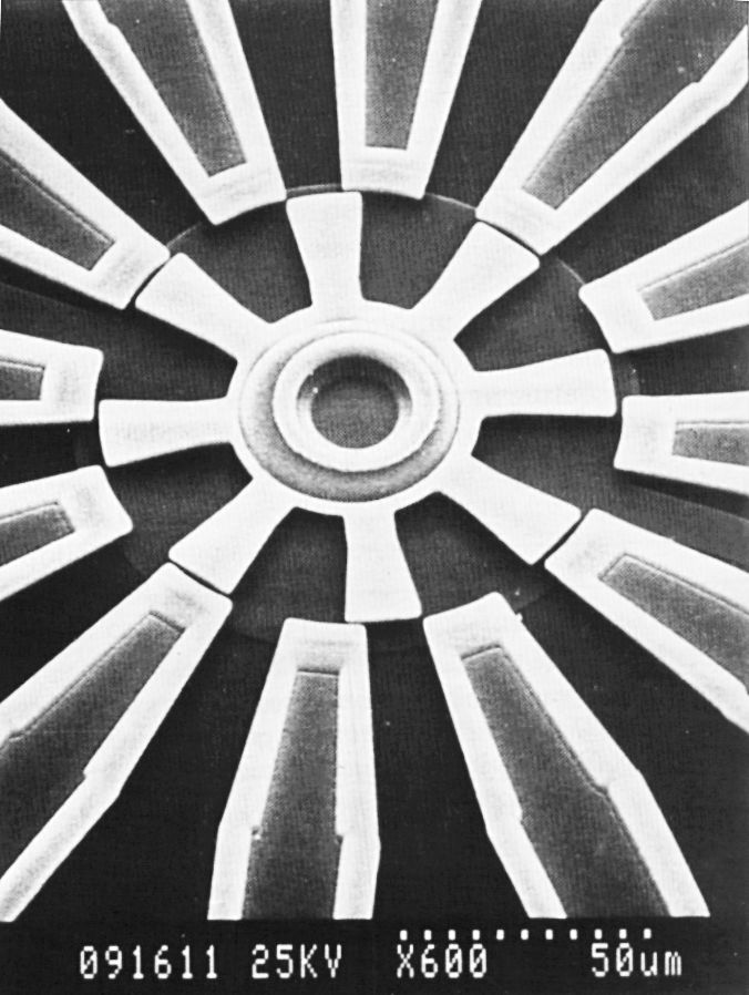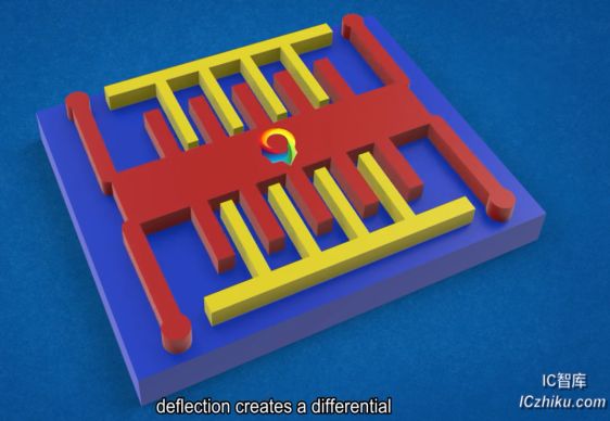 MEMS技术广泛应用于国防航天、光电影像、生化医疗、微波通讯及汽车工业等各个领域。例如汽车上用的微型加速度计、投影仪中用的微镜、打印机中用的微型喷头,极大地方便了人们的生产生活。下图是利用微加工技术制造的微型指叉式加速度计,它是标准的平板电容器。加速度的变化带动活动质量块的移动从而改变平板电容两极的间距和正对面积,通过测量电容变化量来计算加速度,在汽车电子中被广泛应用。