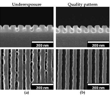 曝光是电子束光刻工序中最复杂的一步,曝光的图形尺寸精度直接影响零件的尺寸精度。曝光剂量对曝光效果的影响最大,若曝光剂量不足,显影时会出现光刻胶残留在硅片表面,显影图案不完整、形状不规则。