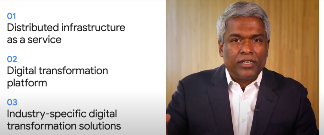 Kurian 谈及 Google Cloud 的使命,「凭借数据驱动型创新支持每一个组织更迅速地实现其业务的数字化转型,重新构想业务模式。」为了达成使命,Google Cloud 提供了三种能力,「基础架构即服务、数字化转型平台、特定行业的数字化转型解决方案。」