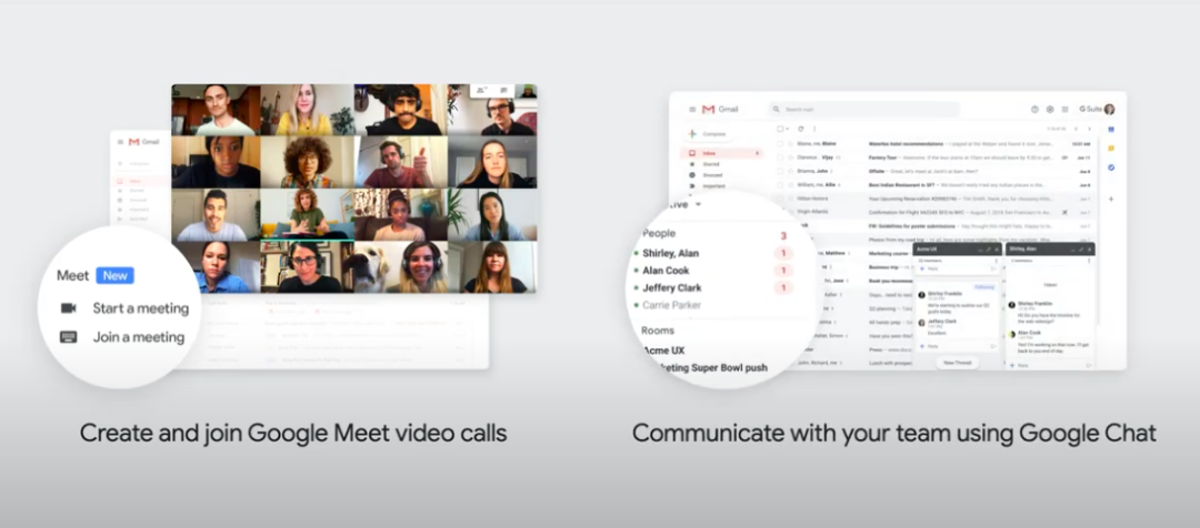 Google 推出 Google Meet 音视频会议软件后,将 Google Meet 与 Chat 同时集成在 Gmail 中,方便企业级用户直接发起。疫情加速 Google 产品线的整合从而提供统一的体验。