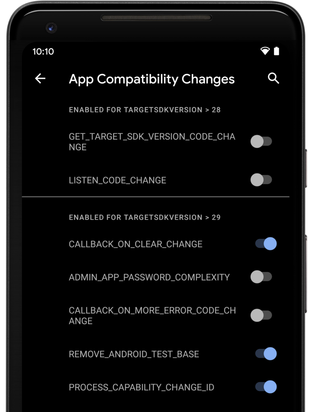 更轻松的测试和调试: 为了帮助您测试兼容性,我们将许多非兼容性变更设置为 "可关闭"。这意味着,您可以通过开发者选项或 adb 强制启用或禁用每一项更改。这样就无需为了一些基本测试而更改 targetSdkVersion 或重新编译您的应用。我们也简化了 Android Studio 自动化测试的流程。访问官方文档查看详细信息。