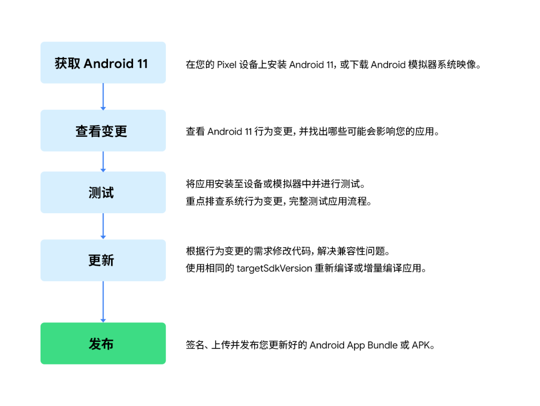 在每个版本中,我们都致力于减少您准备应用时需要完成的工作。在 Android 11 中,我们增加了新的流程、开发者工具和版本里程碑,以最大程度减少平台更新带来的影响并使应用更容易保持兼容。最大限度地降低行为变更影响: 我们的目标始终如一,即在您将应用的 targetSdkVersion 设置为 Android 11 之前,尽可能将这些变更设置为可选项,最大程度减少平台变更对应用带来的影响。如果您通过 Google Play 分发应用,则将有一年以上的时间逐渐适用这些变更。