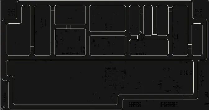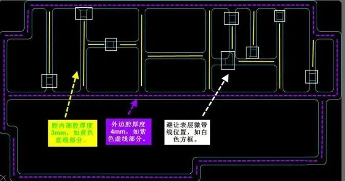 在PCB布局之前需要弄清楚产品的结构。结构需要在PCB板上体现出来(结构与PCB接触部分,即腔壳位置及形状)。比如腔壳的外边厚度大小,中间隔腔的厚度大小,倒角半径大小和隔腔上的螺钉大小等等(换句话说,结构设计是根据完成后的PCB上所画的轮廓(结构部分)进行具体设计的(如果结构已批量开模具,就另当别论了))(螺钉类型有M2\M2.5\M3\M4等)。一般情况,外边腔厚度为4mm;内腔宽度为3mm(点胶工艺的为2mm);倒角半径2.5mm。以PCB板的左下角为原点,隔腔在PCB上的位置需在格点0.5的整数倍上,最少需要做到格点为0.1的整数倍上。这样有利于结构加工,误差控制比较精确。当然,这需要根据具体产品的类型来设计。如下图所示:(PCB设计完成后的结构轮廓图)