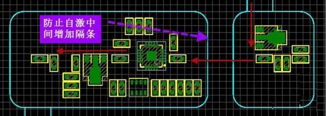 在实际的射频链路布局中,因受产品的空间限制,不可能完全实现“一”字型布局,这就迫使我们将布局成“U”形。布局成U形并不是不可以,但需要在中间加隔腔将其左右进行隔离,做好屏蔽。至于为什么要做屏蔽我就不多讲了。如下图所示: