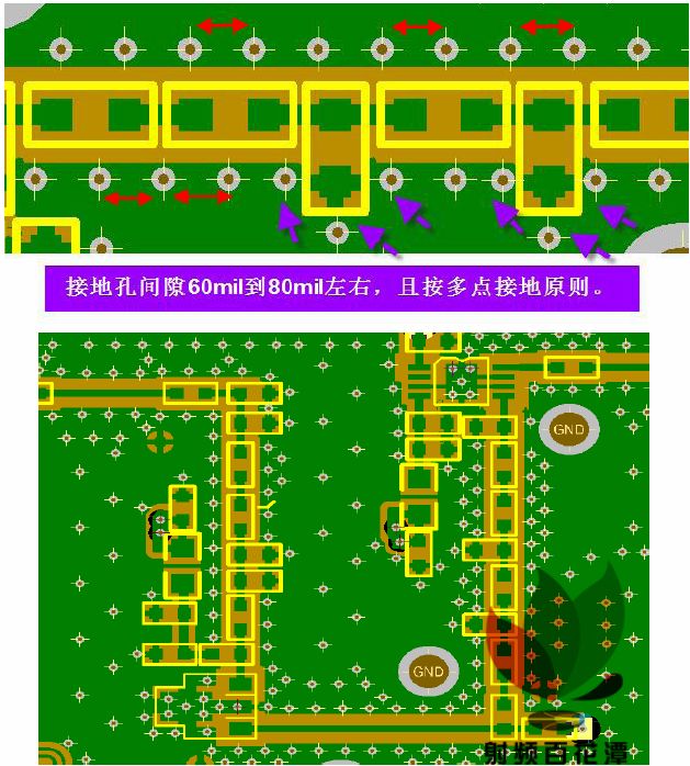 为了让腔壳与PCB板之间更好的接触。一般打两排接地孔且交错方式放置,如下图所示。