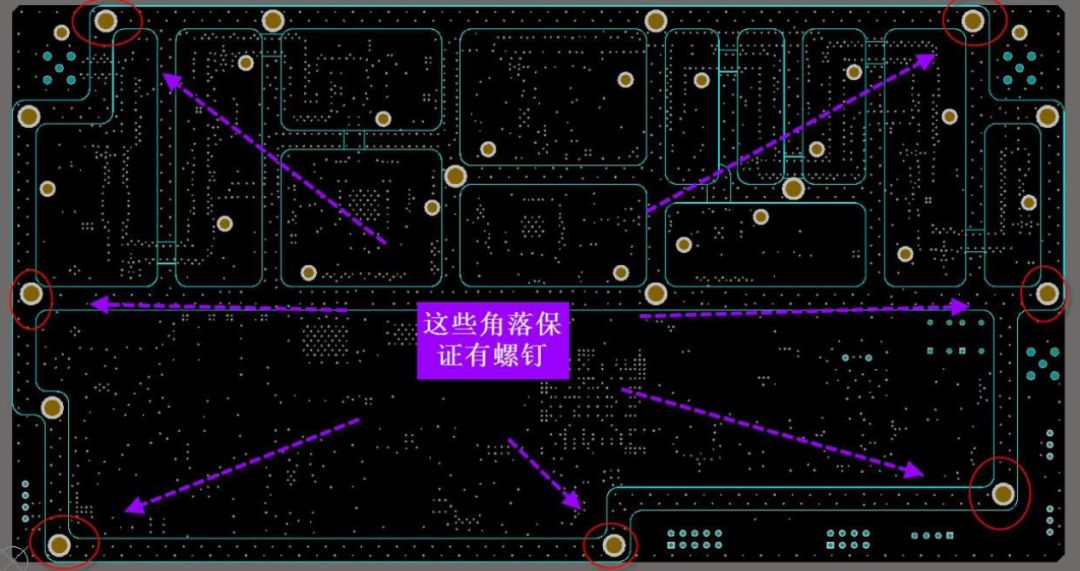 PCB与腔壳之间螺钉放置方法:隔腔每个交叉的地方放置一个螺钉。在实际设计中,实现比较难,可以根据模块电路功能进行适当调整。但不管怎样,腔壳四个角上必须都有螺钉。如下图所示: