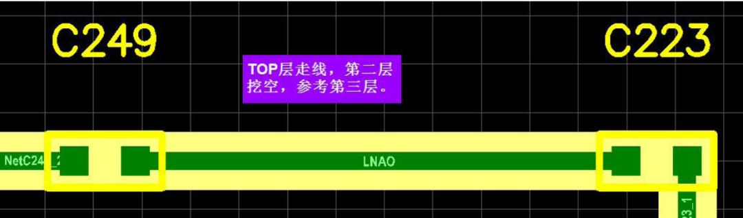 根据50欧姆阻抗线宽进行布线(一般都需要做隔层参考),尽量从焊盘中心出线,走线成直线,尽量走在表层。在需要拐弯的地方做成45度角或圆弧走线,推荐在电容或电阻两边的焊盘作为拐点。如果遇到器件走线匹配要求的,请严格按照datasheet上面的参考值长度及形状走线。比如,一个放大管与电容之间的走线长度(或电感之间的走线长度)要求等等。如下图所示: