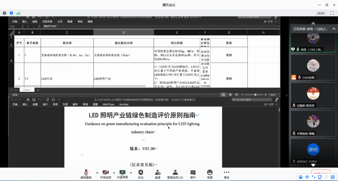 本次起草组线上会议就T/CSA/TR 009-202X《LED照明产业链绿色制造评价原则指南》征求意见稿和《征求意见稿意见汇总答复表》进行讨论。主要针对术语与定义、LED照明产品生产工艺、附录等内容进行充分讨论。各位专家也对该技术报告的书写规范提出了更好的修改意见。