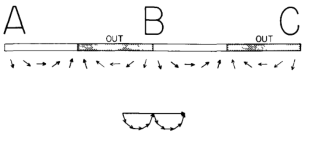 这是一个衍射光栅,即使我们用白光照射它,它也能反射不同颜色的光。衍射光栅的一个简单例子就是光盘!和前文提到的一样,利用箭头可以计算在有镜子处出射的概率。如果我们刮去或覆盖所有指向左边的箭头,我们就可以防止概率互相抵消,进而导致反射发生,这就是衍射光栅的工作原理。用费曼自己的话说: