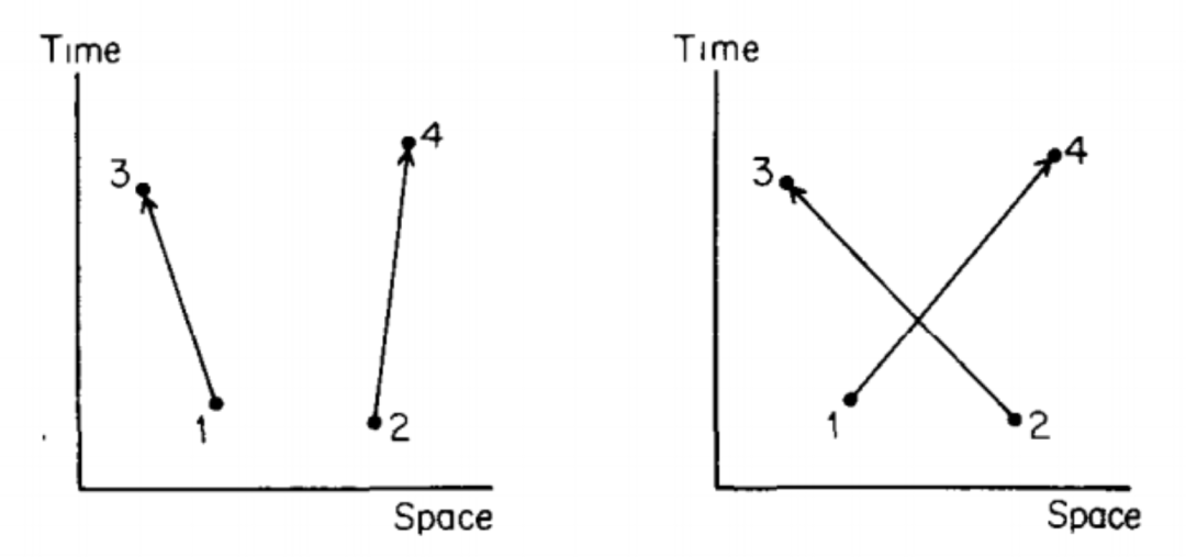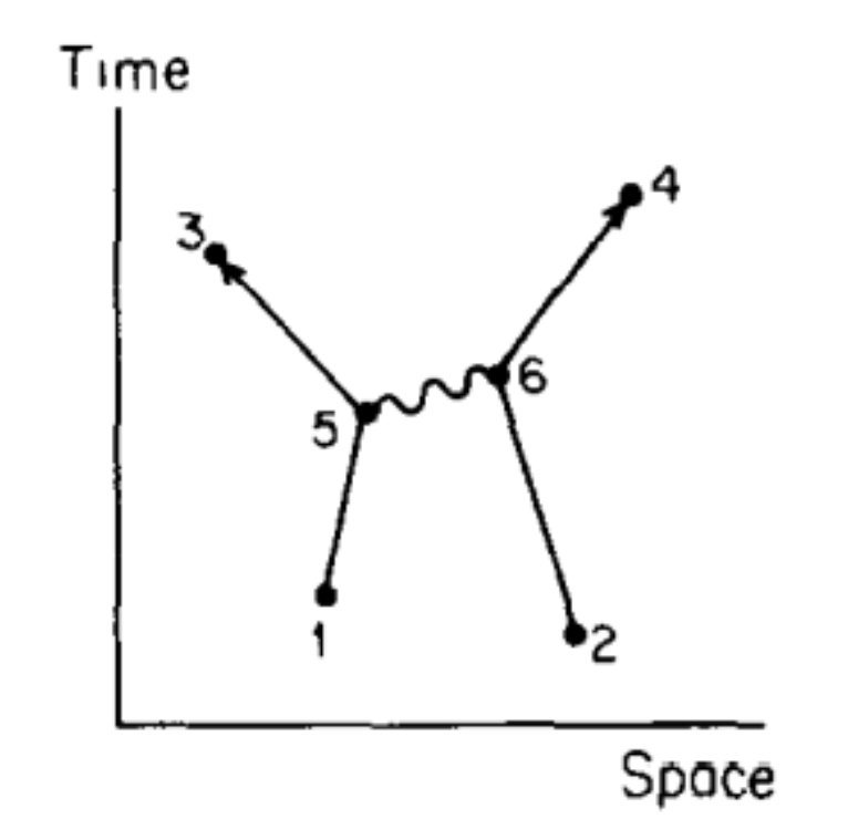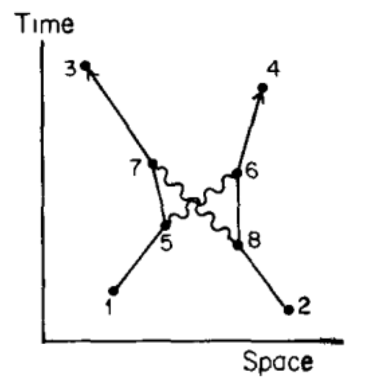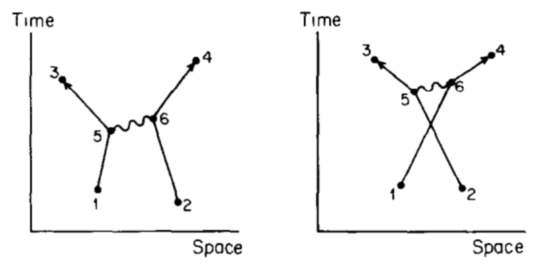 最后,我将谈谈费曼图,这也许是理查德·费曼比同年获得诺贝尔物理学奖的其他物理学家更出名的原因。通常,在量子力学中会使用非常复杂的方程来说明电子和光可以彼此发生相互作用,但是费曼发现了一种用简单的图形来表示各种跃迁概率的方法。在这些图中,直线代表电子,或者反电子,或任何其他粒子,而波浪线代表光子,因为它们的行为与波有相似之处。费曼图中电子在发射或接收光子时发生耦合。上图显示了两个电子如何相互作用。由于动量守恒,其中一个电子可以发射光子并改变其在空间中的运动方向,另一个可以接收光子并改变运动方向。我们知道光子有动量,所以这是合理的,但这只是两个电子相互作用的其中一种方式。