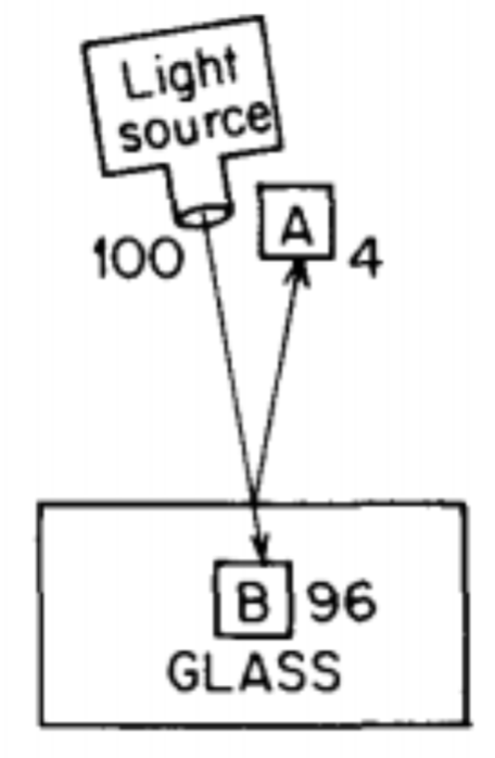 这是关于测量光被玻璃反射面部分反射的实验。对于离开光源的每100个光子,有4个由上表面反射而终止于A处的光电倍增管,而其他96%则穿过上表面而终止于B处的光电倍增管。