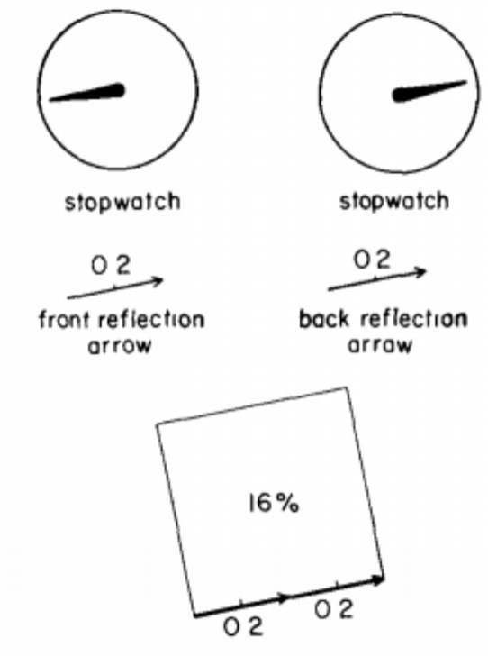 接下来我会告诉你怎么计算反射概率:我们利用箭头和秒表来达到我们的目的。我们假想每种颜色的光都对应一个秒表,其以不同的速度转动指针。这个秒表显示了光子从光源出发到达光电倍增管时所用的时间。所以,当光子击中光电倍增管时,我们按下秒表,记录箭头的方向。