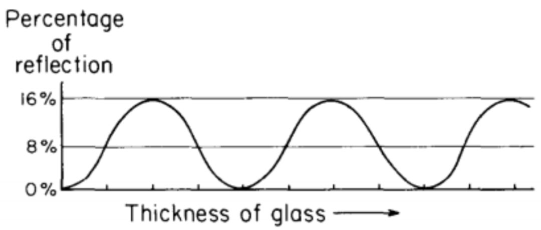 仔细地测量一片玻璃的厚度与部分反射之间关系的实验结果演示了所谓“干涉”的现象。当玻璃厚度增加时,部分反射一直在0与16%之间反复循环,没有迹象表明这个循环会衰弱下去。