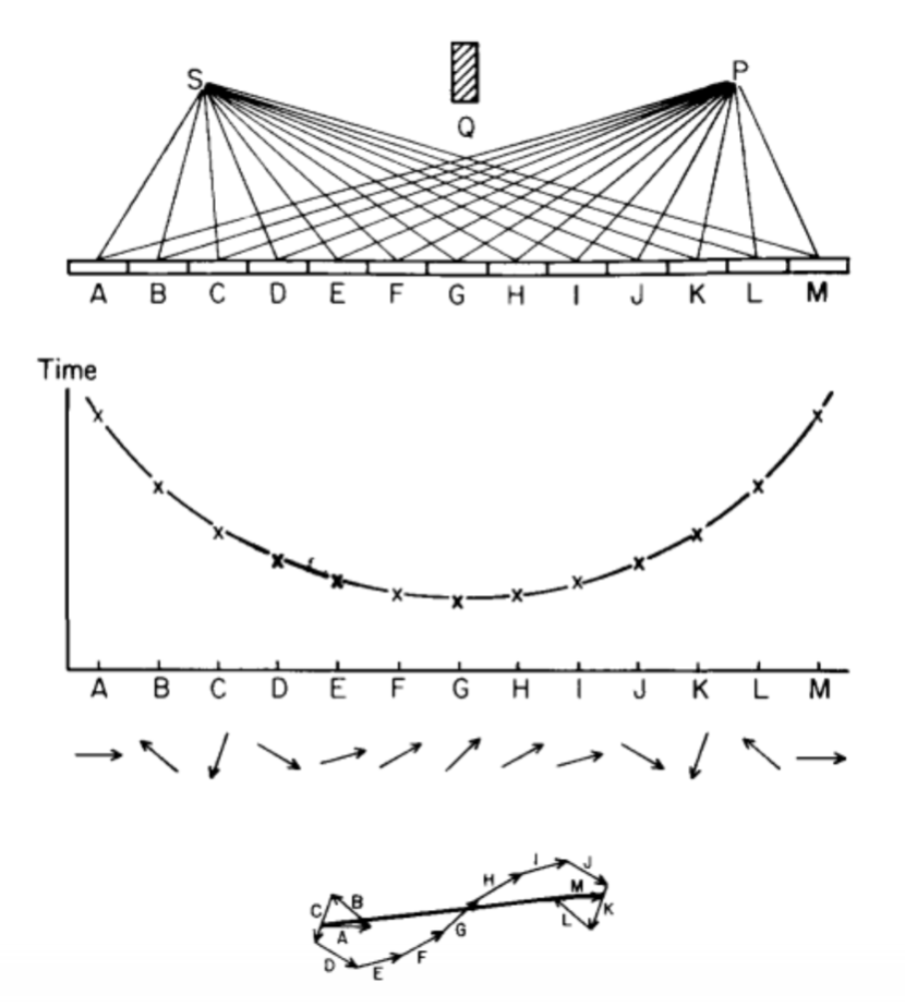 光可能走的所有路径(在这个简化的情况下)见此图的上部,图上各点的正下方标出一个光子从光源途经镜上该点到达光电倍增管所需的时间。它的下面画的是每一个箭头的方向,最下面是所有箭头相加的结果。显然对最终箭头的长度做出主要贡献的是从E到I的箭头,由于这些路径的计时结果几乎相同,它们的方向也就几乎相同。这里也恰好就是所需时间最短的地方。所以,光走的是需要时间最短的路径是大体不错的。