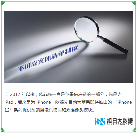 自 2017 年以来,欧菲光一直是苹果供应链的一部分,先是为 iPad,后来是为 iPhone,欧菲光目前为苹果即将推出的 “iPhone 12”系列提供前端摄像头模块和双摄像头模块。