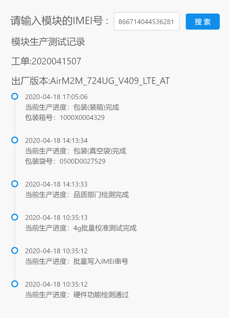 自动化检测系统使得供应链各环节均可掌控和追溯,为模组品质提供了保障,也方便客户后期对产品的管理:客户只需在合宙ERP中录入模组IMEI,即可实时查询该模组的联网记录;量产模组可通过输入箱/袋号码,一键下载对应包装内的IMEI列表。