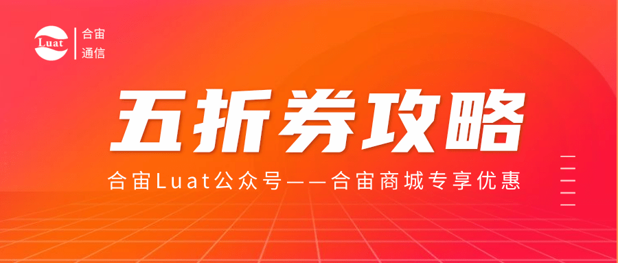 关注合宙Luat公众号并后台留言:五折券,获取助力码后每邀请五位好友成功助力,即可获得五折券一张,多分享多获赠。