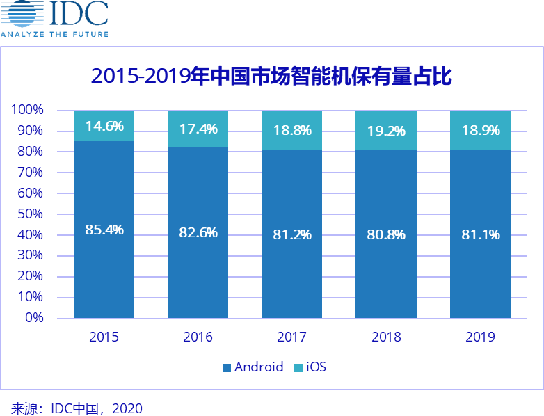 根据2020年的《IDC中国手机保有量报告》,2019年,搭载iOS系统的iPhone在中国智能手机保有量达到了18.9%的份额,是保有量基数最大的厂商。