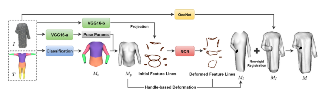众所周知,服装的领口、袖口、下摆线等位置的三维服装特征线在展现服装的轮廓中起到决定性的作用。因此,本文首先根据输入图像,使用图像引导的图卷积神经网络(GCN)预测三维服装特征线的位置和性状,并以此作为基于手柄的形变方法(Handle-baseddeformation) 的硬性约束,将服装模板网格首先形变至与输入图像中服装宏观性状接近的形状。