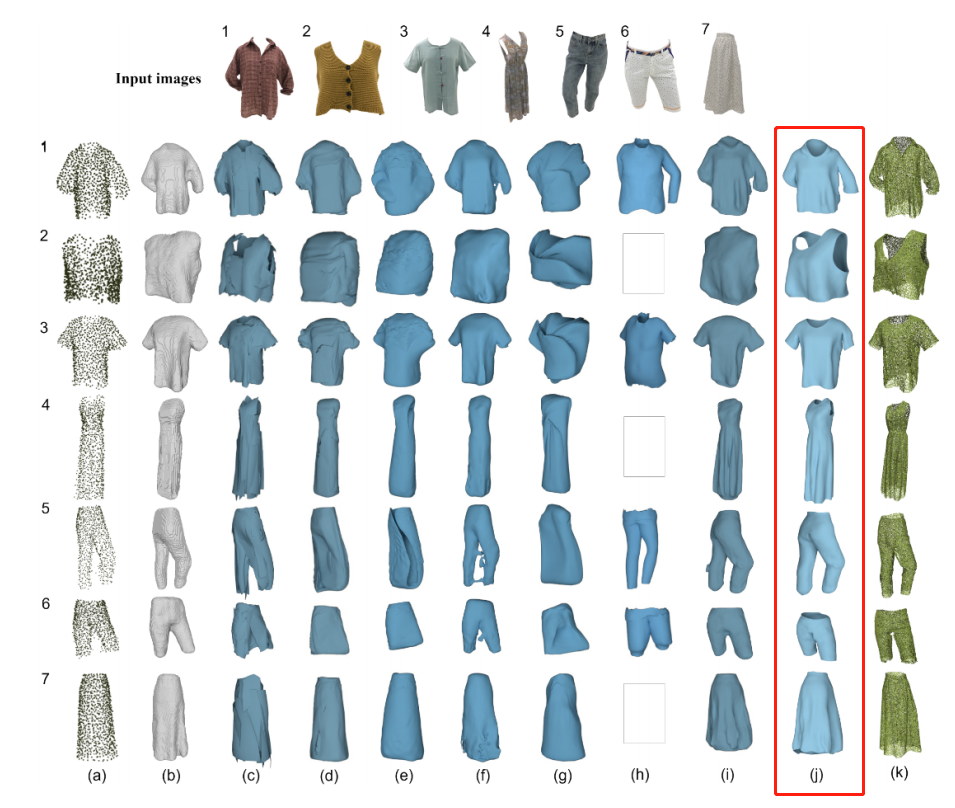 图3 用于对比的单视角重建方法在Deep Fashion3D测试集上的重建结果,(j)列为本文的方法