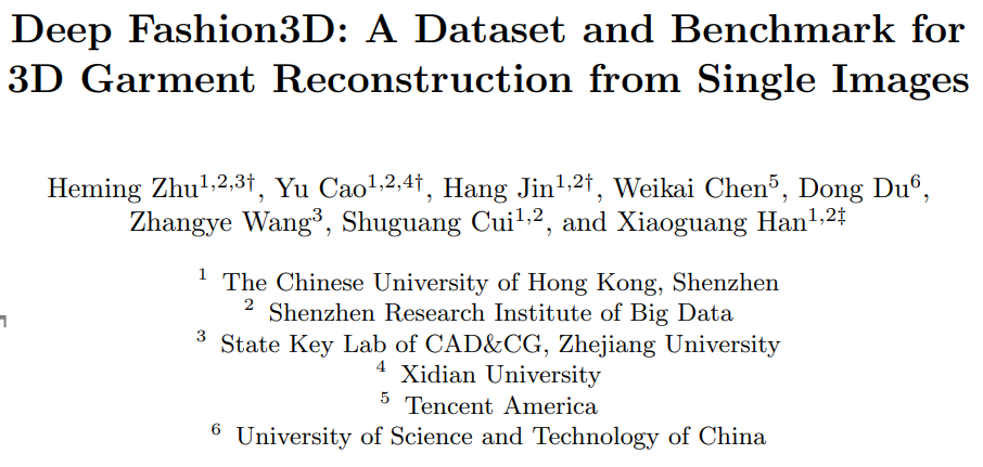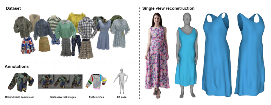 然而,与开展的如火如荼的单张图像估计人体三维姿态、非穿衣人体形状相比,以单张图像作为输入,恢复图像中三维服装的研究进展相对缓慢。除去重建三维服装模型任务自身的难度外,另一个更重要的原因是研究领域内缺乏大规模的、包含现实中多种服装的三维服装数据集。相比二维服装图像能够通过网络进行高效的搜集,高质量的三维服装模型往往需要在实验室环境内,通过扫描、或多视角重建的方法才能获得;由于服装的形状具有极大的复杂性,从采集的三维人体点云剥离出边界分明的服装部分往往需要费时费力的人工操作,也进一步增加了建立大规模三位服装数据集的困难。