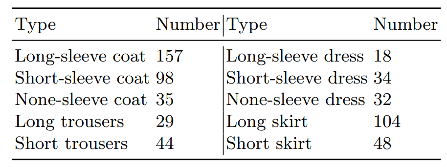 为体现现实世界中服装款式与种类的多样性,Deep Fashion3D采集了10个服装种类共563件不同的服装,数据集中包含的服装种类包括:长袖衫、短袖衫、无袖衫、长裤、短裤、长袖连衣裙、短袖连衣裙、无袖连衣裙、长裙以及短裙。对于每一件待采集服装,本文将其穿着于假人或真人模特身上,并摆出不同的动作以产生多样化的真实褶皱。最终,经过对每一件待采集服装进行姿态上的增强,一共563件三维服装模型通过上文提出的数据采集流程被重建出来。