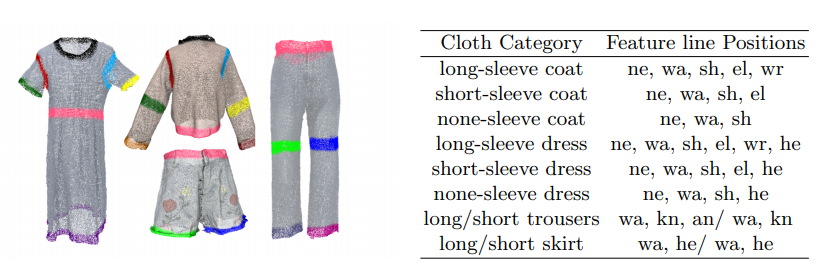 特别的,本文首次提出了三维服装特征线的标注方式。与人脸关键点相似,三维服装特征线展现了如服装开放边界、颈线、腰线、下摆线等服装最为显著的特征,能够为三维服装重建及分析等相关任务提供强大的先验知识。