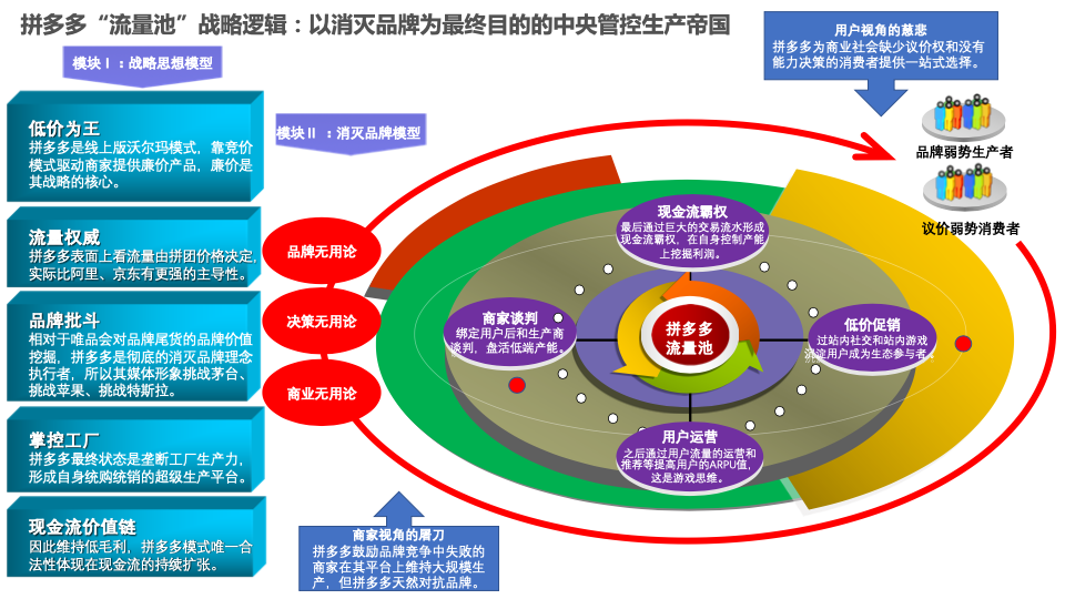 总体看,拼多多表达的所谓“颠覆式“战略逻辑来自游戏的导流和沉迷付费思维,用这个来做本质是服务性的电商平台,但这是打法,不是战略创新,目前还没有迹象证明了“养人玩、买东西”是高效率的。真实一面:拼多多力求构建以消灭品牌,形成F2C(工厂到消费者)的中央生产帝国,根本的核心战略支撑点是流量池,这也被很多人认为是电商行业的中心思想。逻辑循环是通过“低价促销”吸引用户,并通过站内社交和站内游戏沉淀用户成为生态参与者;之后通过“用户运营”的方式通过AI推荐等提高用户的ARPU值,这是游戏思维;再之后进入“商家谈判”环节,绑定用户后和生产商谈判,盘活低端产能;最后就是最后通过巨大的交易流水形成“现金流霸权”,在品牌商家和自身控制产能上挖掘利润。
