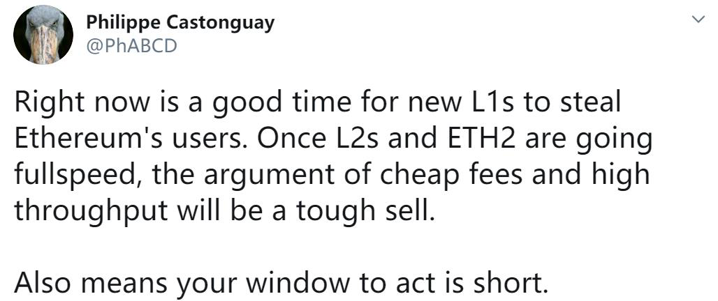 以太坊研发人员Philippe Castonguay在7月28日就公开直言:现在是新的Layer-1窃取以太坊用户的最好时机。否则一旦接下来Layer-2和ETH2.0全速前进,廉价费用和高吞吐量的优势会让,给Layer-1所留的最后行动窗口,很短。