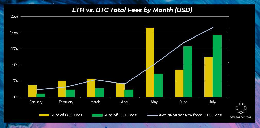 Delphi Digital的最新报告显示,在过去的两个月里,以太坊链上的交易费用已经超过了比特币——此期间ETH的累积交易费用为4670万美元,比特币为2500万美元。