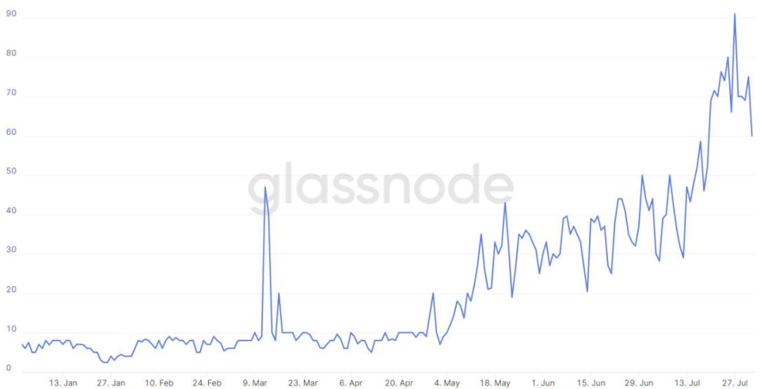 在DeFi风声水起和ETH价格创出年度新高的关键时刻,以太坊网络交易费用也在持续上行半年之际迎来暴涨。Glassnode数据显示,5月份以来以太坊日均Gas费用就开始持续高企,7月27日更是一度突破90Gwei,较年初上涨将近20倍。