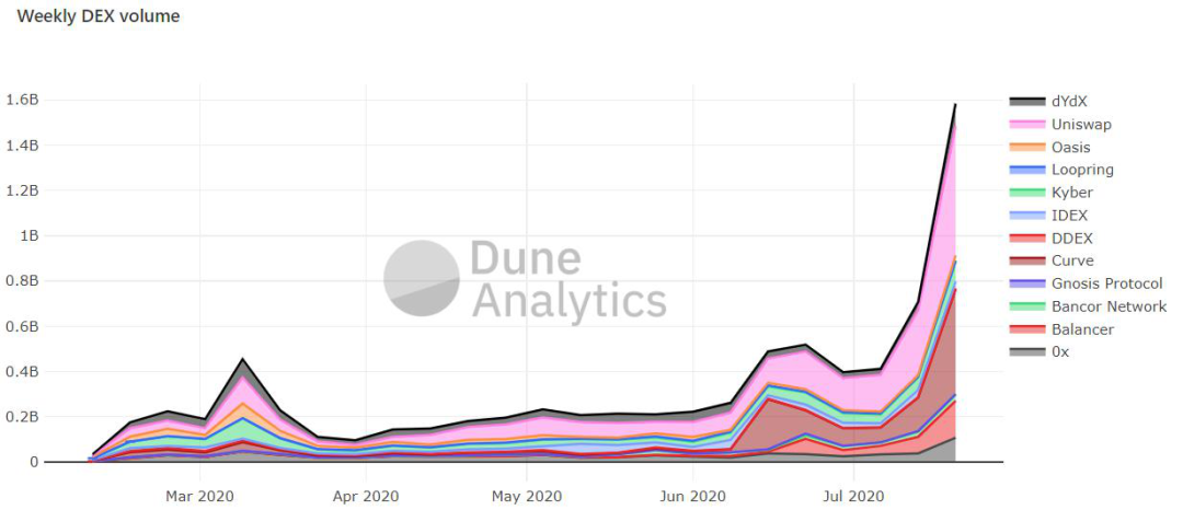 以其中的DEX赛道为例,7月份总交易额已经达到了42亿美元,而去年DEX总交易额仅为24亿美元。其中的明星项目Uniswap和Curve Finance更是堪称疯狂,日交易量在7月突破1亿美元大关, Curve Finance的日交易量更是一度突破1.5亿美元,睥睨一众二三线中心化交易平台。