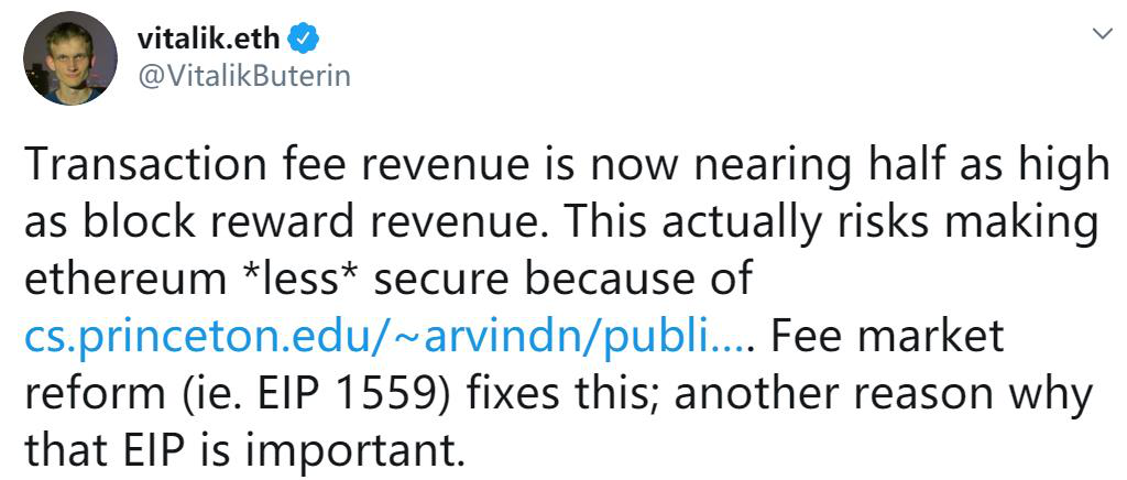 V神专门针对手续费用不断飙升的现状发推,称目前以太坊矿工的收入结构中交易费收入已接近区块奖励的一半,这可能威胁以太坊的安全性,同时他强调“针对费用市场的提案(例如EIP 1559)可解决这一问题”。