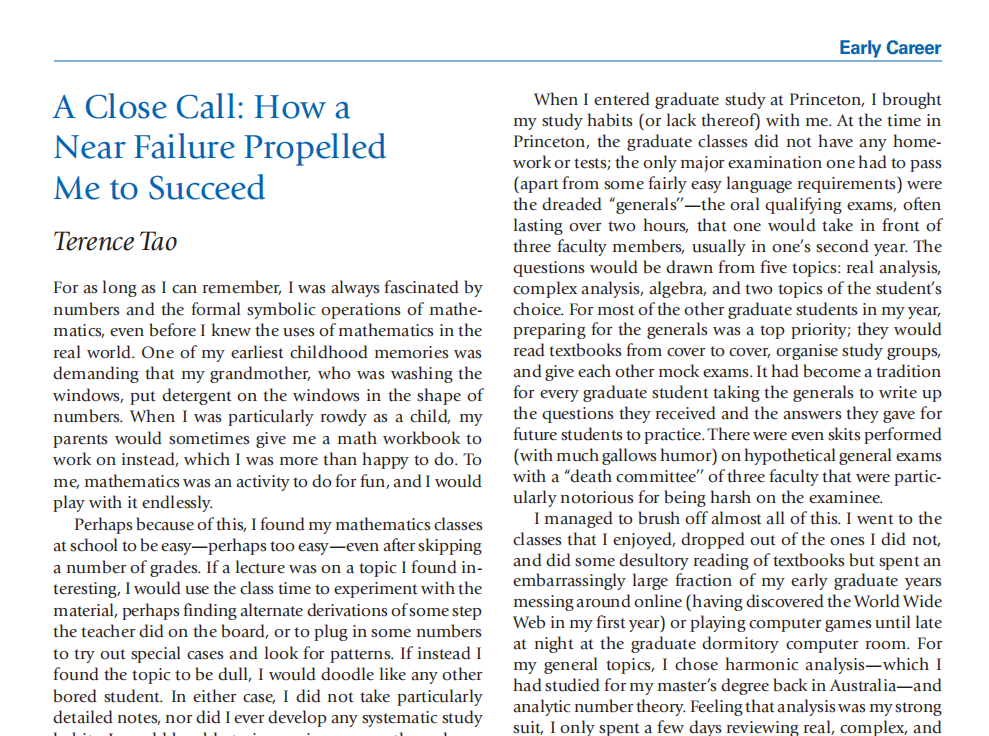 很难相信,智商高达 230 的陶哲轩(Terence Tao),也会在一场考试中险些挂科。从这篇自述文章中,我们可以近距离感受到,数学天才的荣耀背后,是多少个不懈探索的日日夜夜。