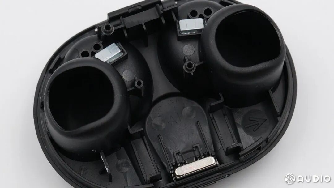 取下电池和充电盒主板,充电座舱内侧展示。耳机入耳处位置有两个磁铁,用于吸附耳机;盒盖开合处有一个磁铁,用于吸附盒盖。