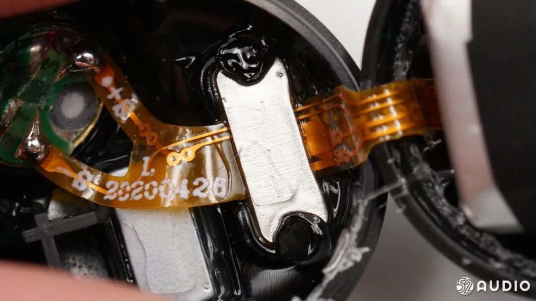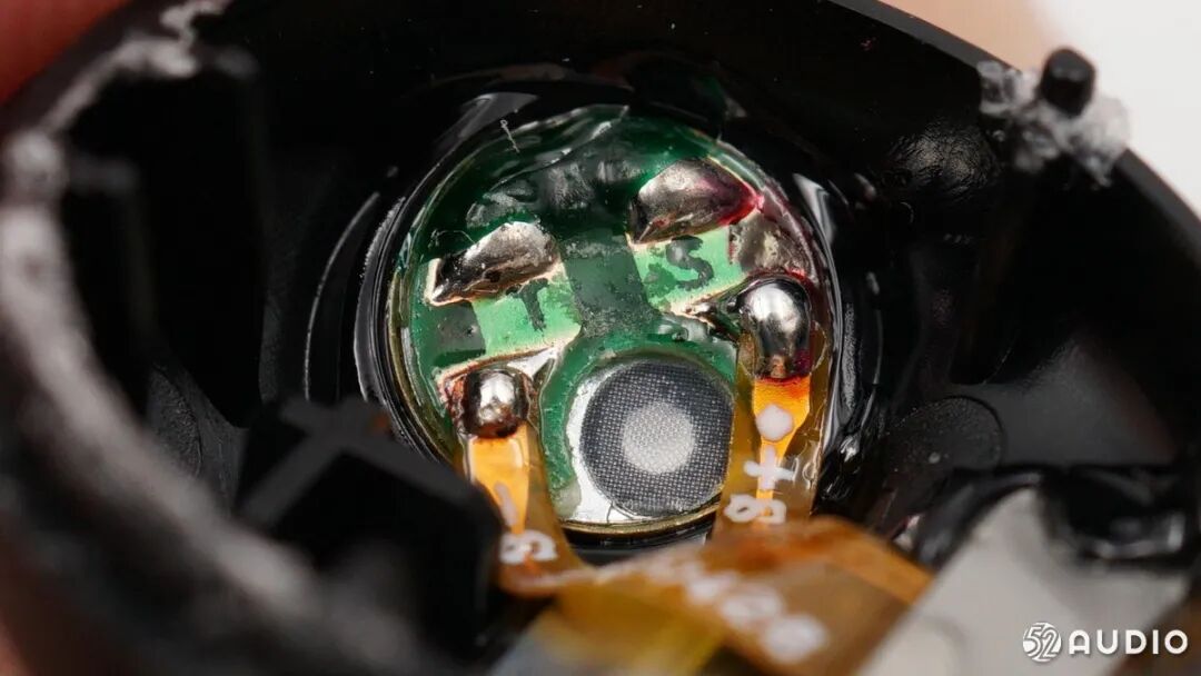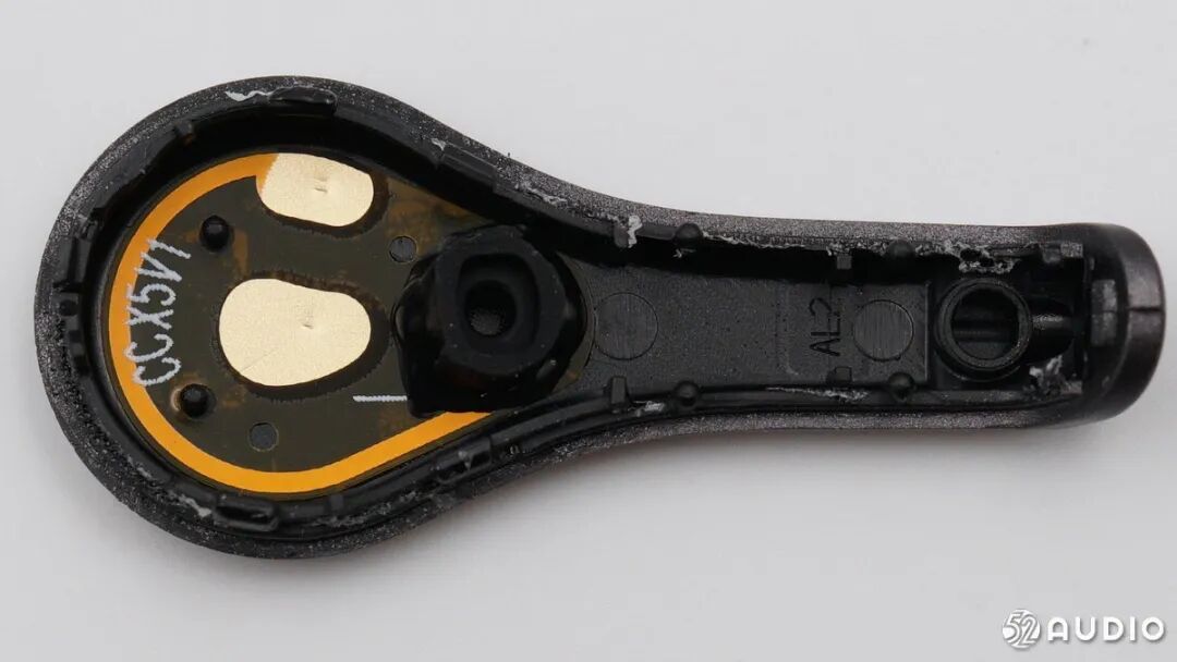 耳机音腔内部的结构与X3相似,扬声器通过FPC与主板相连,中间银色的是磁铁,磁铁右侧金属挡板下是充电触点,电路非常清晰。