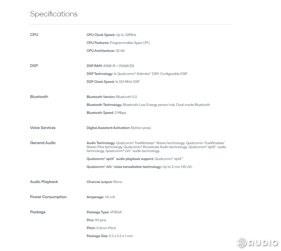 声迈X5的主控芯片为高通QCC3020。这是一款低功耗蓝牙音频SoC,采用FBGA封装,专为TWS真无线耳机而设计。支持高通特有的aptX高规格解码,延时更低、容错性好,能够解锁音乐的更多细节。