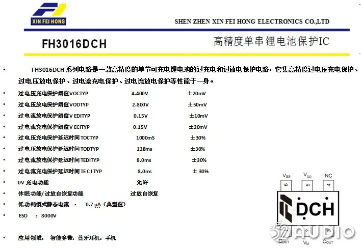 充电盒输出的电流在进入耳机电池之前,要经过一道由电池保护板组成的保护电路。声迈X5采用的是鑫飞宏的保护电路,由一个FH3016DCH高精度单串锂电池保护IC和一个FH8205A N-MOS管组成。