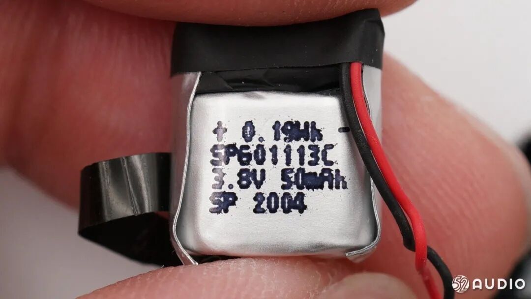 声迈X5采用电池制造商“惠州市超聚电池有限公司”的聚合物锂电池,型号SP601113C,采用高电压方案3.8V(有利于能量的提升),容量50mAh,尺寸:5.6*11*13.2mm(Max)。