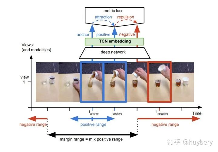第一种思想是基于帧的相似性[17],对于视频中的每一帧,其实存在着特征相似的概念,简单来说我们可以认为视频中的相邻帧特征是相似的,而相隔较远的视频帧是不相似的,通过构建这种相似(position)和不相似(negative)的样本来进行自监督约束。