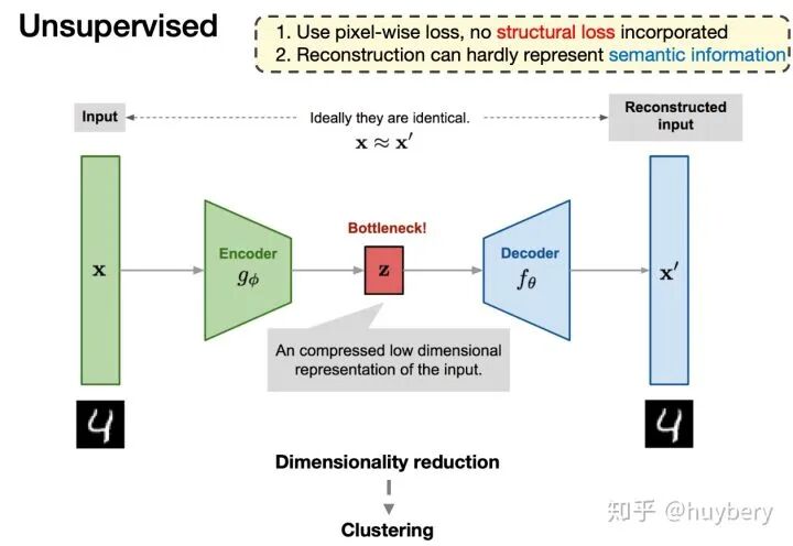 监督学习利用大量的标注数据来训练模型,模型的预测和数据的真实标签产生损失后进行反向传播,通过不断的学习,最终可以获得识别新样本的能力。而无监督学习 不依赖任何标签值,通过对数据内在特征的挖掘,找到样本间的关系,比如聚类相关的任务。有监督和无监督最主要的区别在于模型在训练时是否需要人工标注的标签信息。 无监督学习 中被广泛采用的方式是自动编码器 (autoencoder ):