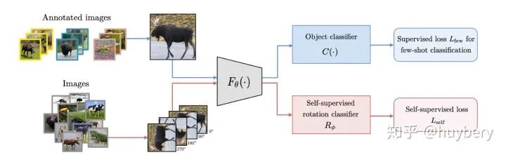 Lee, Hankook et al [14]探索了在多任务学习中增加自监督学习的可能,他们将普通的分类任务中嵌入了旋转预测任务。除了简单的多任务学习,也可以设计 联合学习策略,直接预测两种监督信息。同样的想法也被用到了小样本学习 [15]中,一个分支进行传统的小样本分类,另一个分支来进行自监督旋转预测,虽然这篇文章的想法和设计 不是很亮眼,但提升还是比较明显的。
