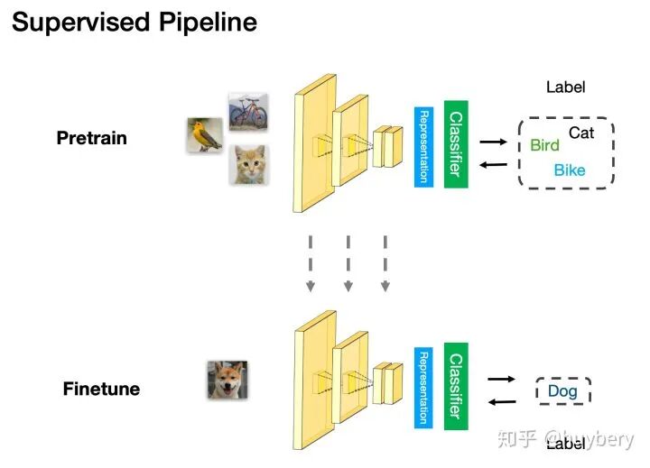 编码器 将输入的样本映射到隐层向量,解码器 将这个隐层向量映射回样本空间。我们期待网络的输入和输出可以保持一致(理想情况,无损重构),同时隐层向量的维度大大小于输入样本的维度,以此达到了降维的目的,利用学习到的隐层向量再进行聚类等任务时将更加的简单高效。对于如何学习隐层向量的研究,可以称之为表征学习(Representation Learning) 。但这种简单的编码-解码结构仍然存在很多问题,基于像素的重构损失通常假设每个像素之间都是独立的,从而降低了它们对相关性或复杂结构进行建模 的能力。尤其使用 L1 或 L2 损失来衡量输入和输出之间的差距其实是不存在语义信息的,而过分的关注像素级别的细节而忽略了更为重要的语义特征。对于自编码器 ,可能仅仅是做了维度的降低而已,我们希望学习的目的不仅仅是维度更低,还可以包含更多的语义 特征,让模型懂的输入究竟是什么,从而帮助下游任务。而自监督学习最主要的目的就是学习到更丰富的语义表征。自监督学习主要是利用辅助任务(pretext)从大规模的无监督数据中挖掘自身的监督信息,通过这种构造的监督信息对网络进行训练,从而可以学习到对下游任务有价值的表征。 从数据的本身出发,如何设计 有效的辅助任务 pretext? 对于第三点,评测自监督学习的能力,主要是通过 Pretrain-Fintune 的模式。我们首先回顾下监督学习中的 Pretrain - Finetune 流程:我们首先从大量的有标签数据 上进行训练,得到预训练的模型,然后对于新的下游任务(Downstream task),我们将学习到的参数进行迁移,在新的有标签任务上进行「微调」,从而得到一个能适应新任务的网络。而自监督的 Pretrain - Finetune 流程:首先从大量的无标签数据 中通过 pretext 来训练网络,得到预训练的模型,然后对于新的下游任务,和监督学习一样,迁移学习 到的参数后微调即可。所以自监督学习的能力主要由下游任务的性能来体现。