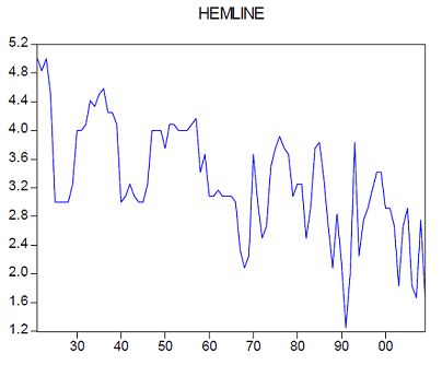 1分:迷你裙2分:芭蕾舞演员那样在膝盖以上的裙子长度3分:在膝盖以下的裙子长度4分:裙摆到了脚踝的长裙5分:晚装礼服一样的拖地长裙下图是据此计算得到的,从 1921 年到 2009 年最流行裙子的平均长度分数。