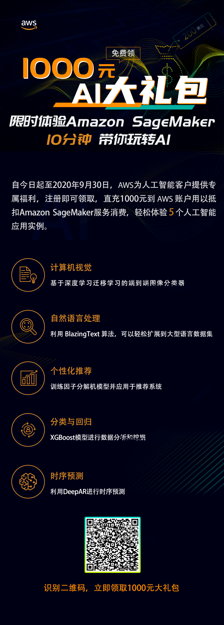 现在,企业开发者可以免费领取1000元服务抵扣券,轻松上手Amazon SageMaker,快速体验5个人工智能应用实例。