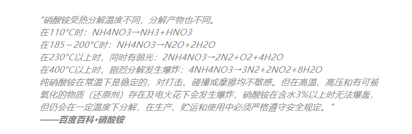 硝酸铵是一种物理性质和化学性质都十分复杂的物质,在一般情况下,硝酸铵是稳定和安全的。硝酸铵在不同的温度,有不同的分解产物。